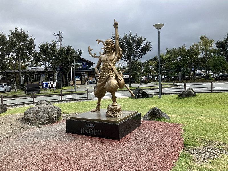 阿蘇駅前にワンピースウソップ像 |