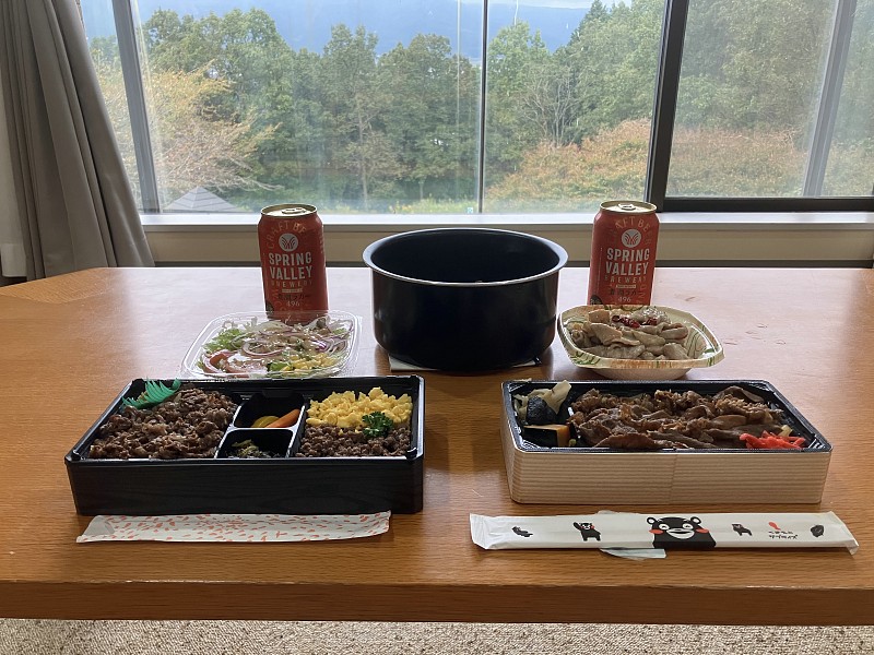 トテルに着いて本日のディナー、道の駅阿蘇でゲットした牛肉弁当 |