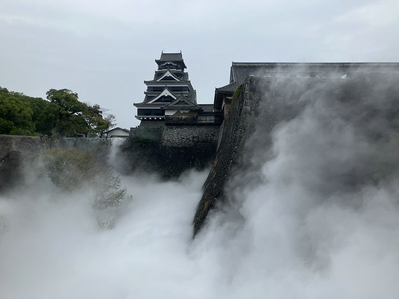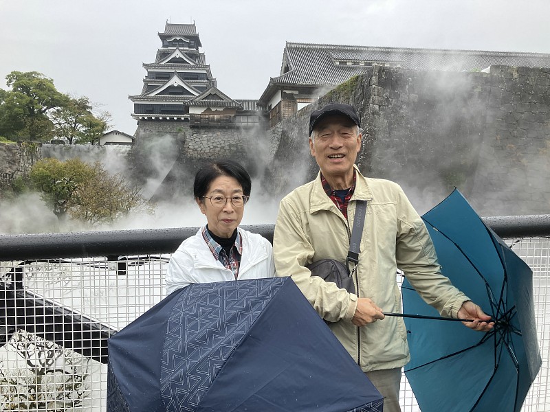降り続く雨に阿蘇観光を変更し熊本城に向かいました 一時間ほどの行程ですが朝の渋滞で倍かかりました 震災復興工事と観光を両立させる特設デッキにより動線が規制されていました |
