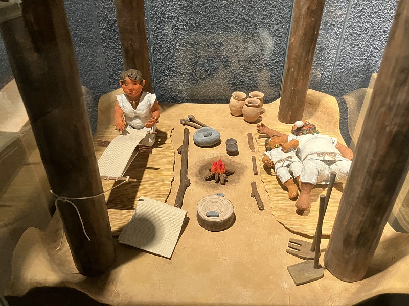 マンガチックなジオラマ展示、我々にはすごく分かり易かった 竪穴式住居の中でお父さんと子供が寝ている脇でお母さんが夜なべしている様子 |