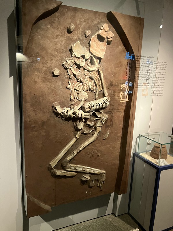 近くの新町貝塚から発掘された女性の人骨、腕に貝製腕輪を付けています |